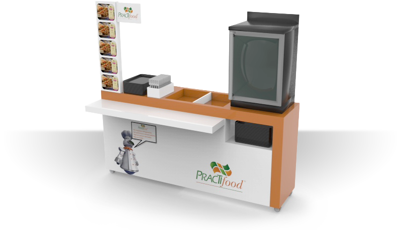 En este servicio el comensal eligirá de los dispensadores que prevén 5 opciones de menú por semana a su elección, con una porción de mínimo 410g para el caso de guisados con guarnición, y para las opciones de pastas, antojos y platillos caldosos con gramajes variables y deberá calentarlo por minuto y medio en horno de microondas.